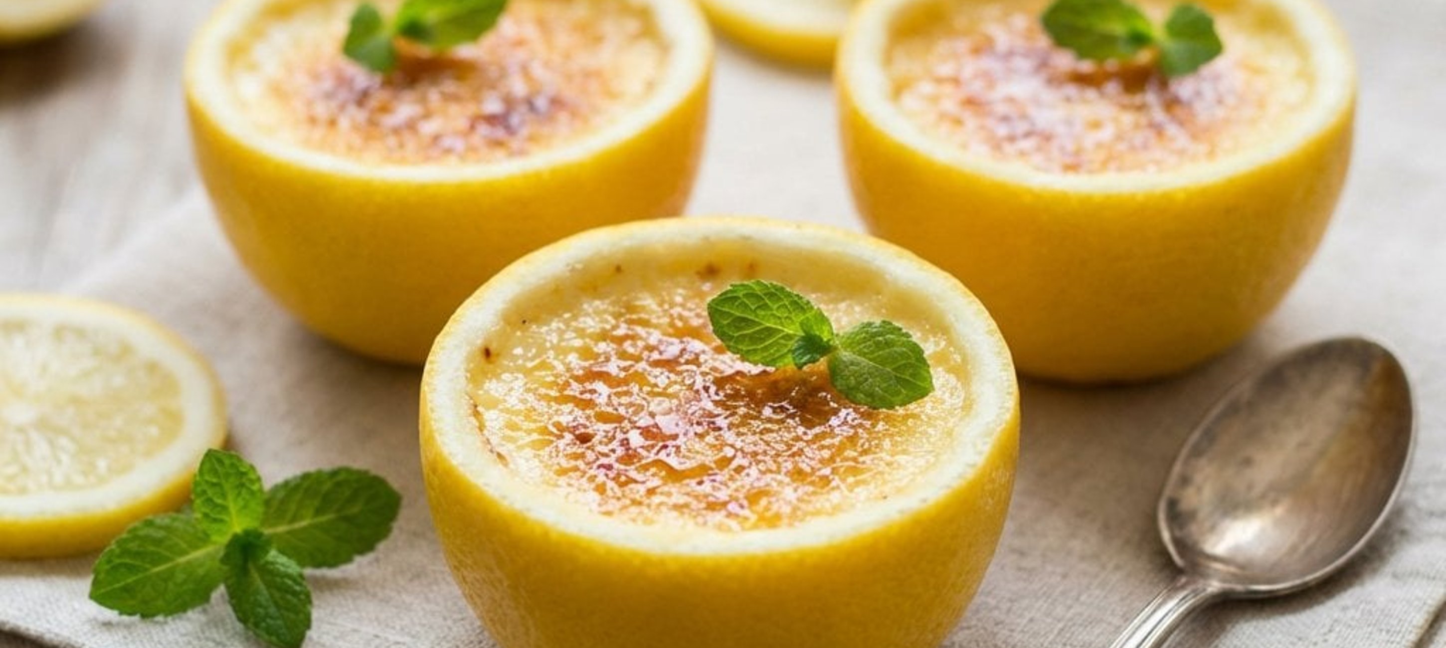 - 1După coacere, scoateți cu grijă tava din cuptor. Transferați lămâile pe un platou și lăsați-le să se răcească în frigider pentru cel puțin 3 ore, ideal peste noapte. Înainte de servire, presărați un strat subțire de zahăr pe suprafața fiecărei porții și caramelizați-l folosind o torță de bucătărie sau sub grill-ul cuptorului până se formează o crustă aurie și crocantă.
