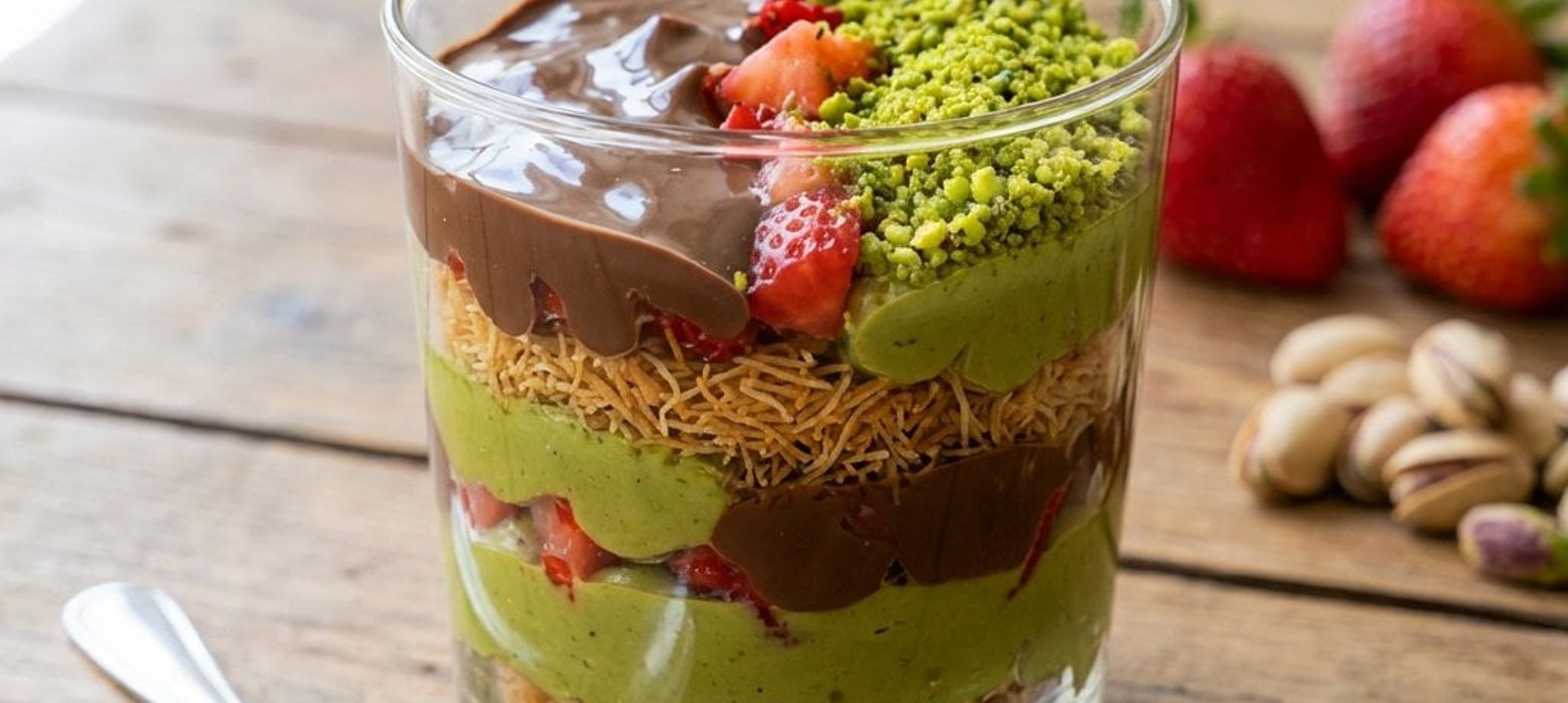 - 4În pahare de servire, așezați straturi succesive: căpșuni tăiate, amestecul de kataifi cu fistic, ciocolata topită și restul de cremă de fistic. Decorați la final cu fistic tocat.