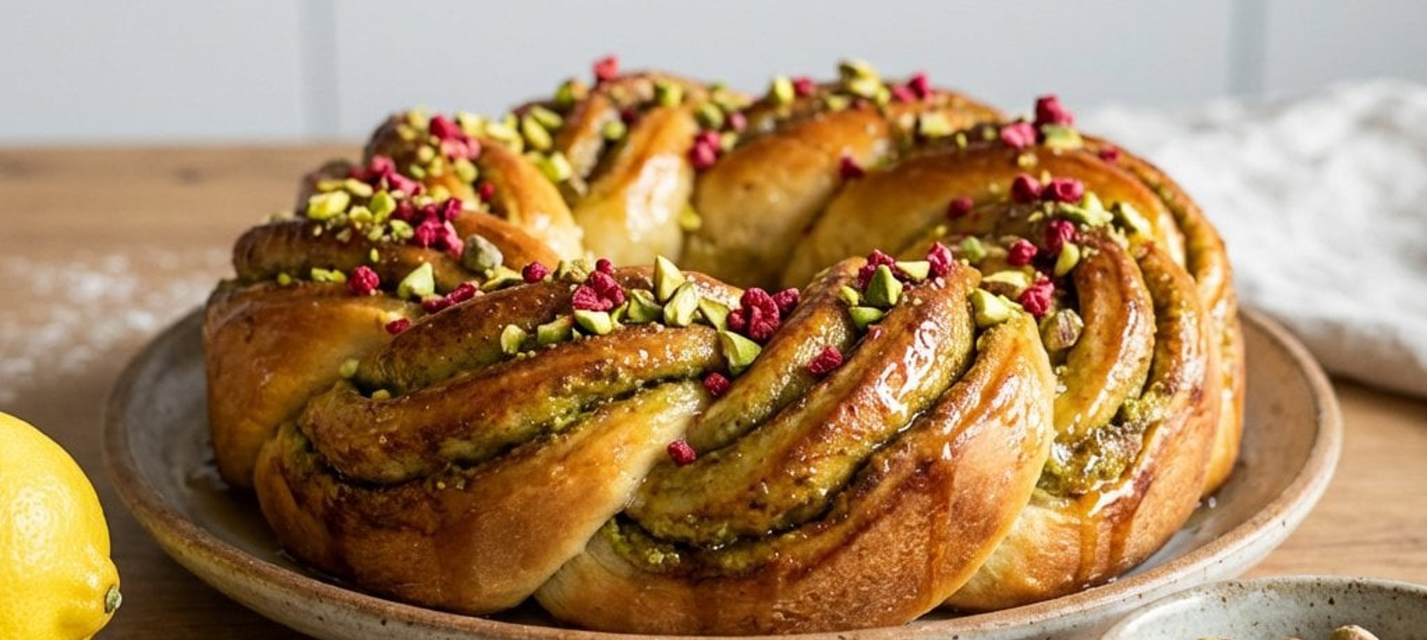 - 2Întinde aluatul dospit pe o suprafață presărată cu făină, formând un dreptunghi. Unge-l uniform cu umplutura de fistic, presară fructe liofilizate zdrobite (opțional) și rulează-l strâns. Taie rulada pe lungime în două și împletește cele două fâșii. Formează o coroană și așază cozonacul într-o formă rotundă tapetată cu hârtie de copt. Mai lasă-l la dospit încă 20 de minute.