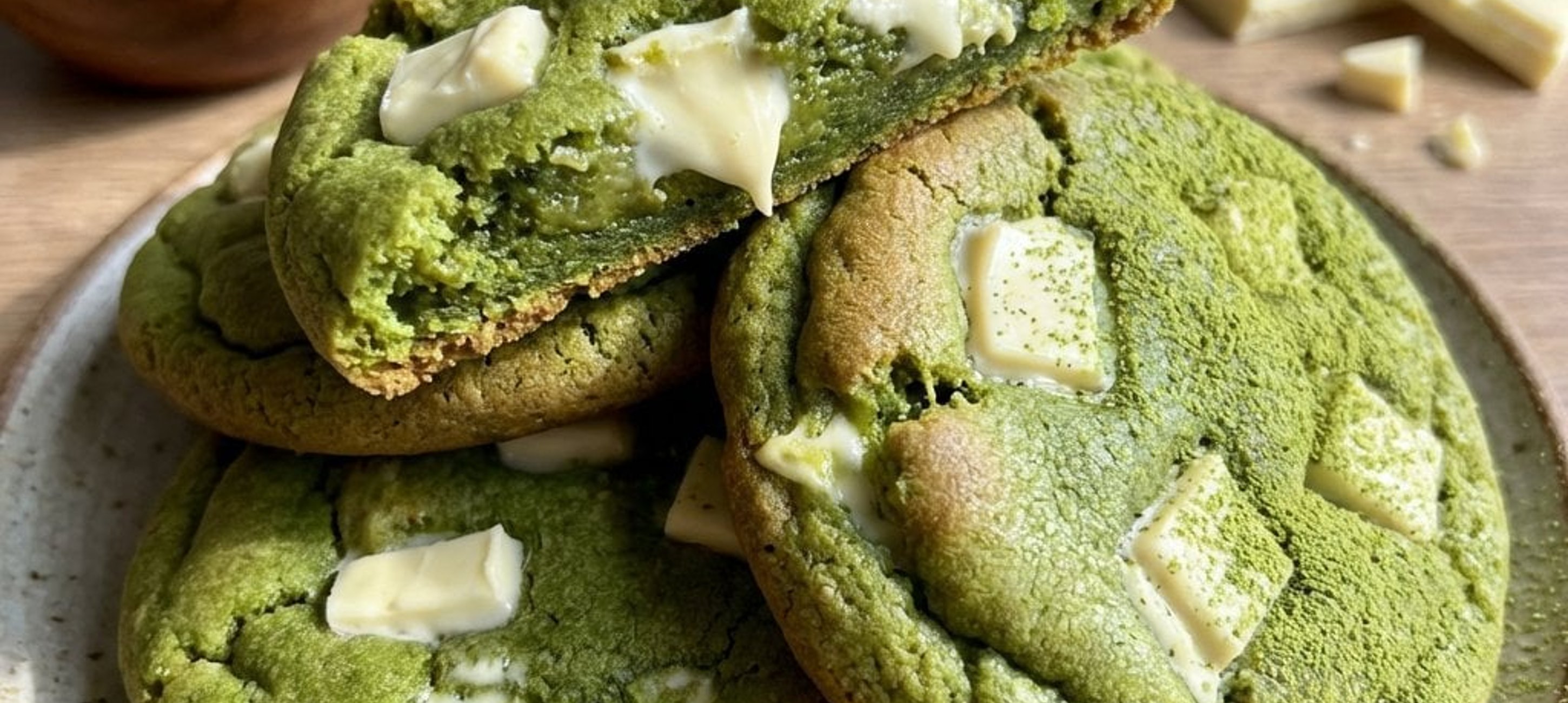- 2Într-un bol separat, amestecați făina cu sarea, praful de copt și bicarbonatul de sodiu. Adăugați pudra de matcha și încorporați amestecul uscat în compoziția de unt folosind o spatulă de patiserie. Nu folosiți mixerul; amestecați doar până când ingredientele sunt încorporate. La final, adăugați ciocolata albă tăiată bucățele sau bănuții de ciocolată.