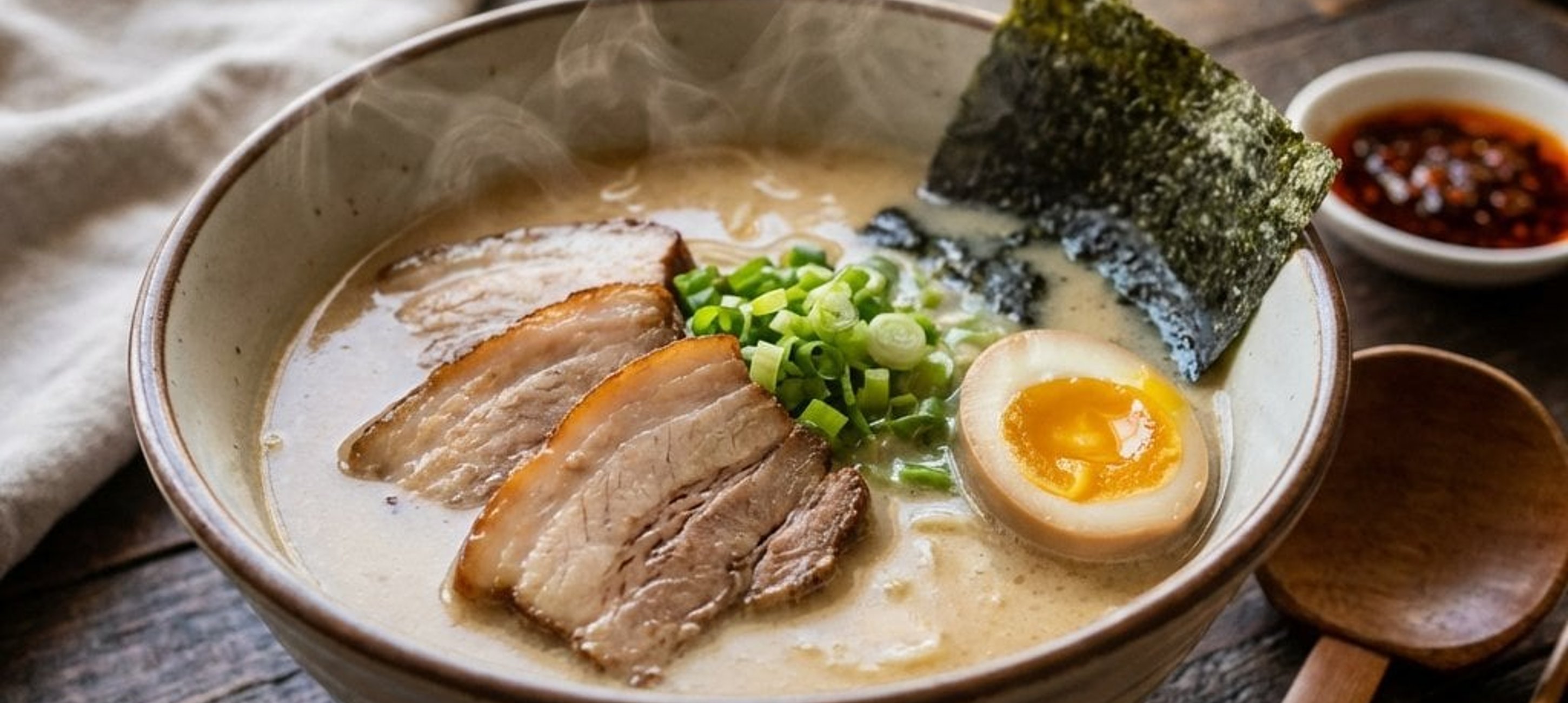 - 4În fiecare bol, așezați: tăițeii → bulionul → feliile de carne → oul → ceapa verde → alga nori. Serviți fierbinte.
