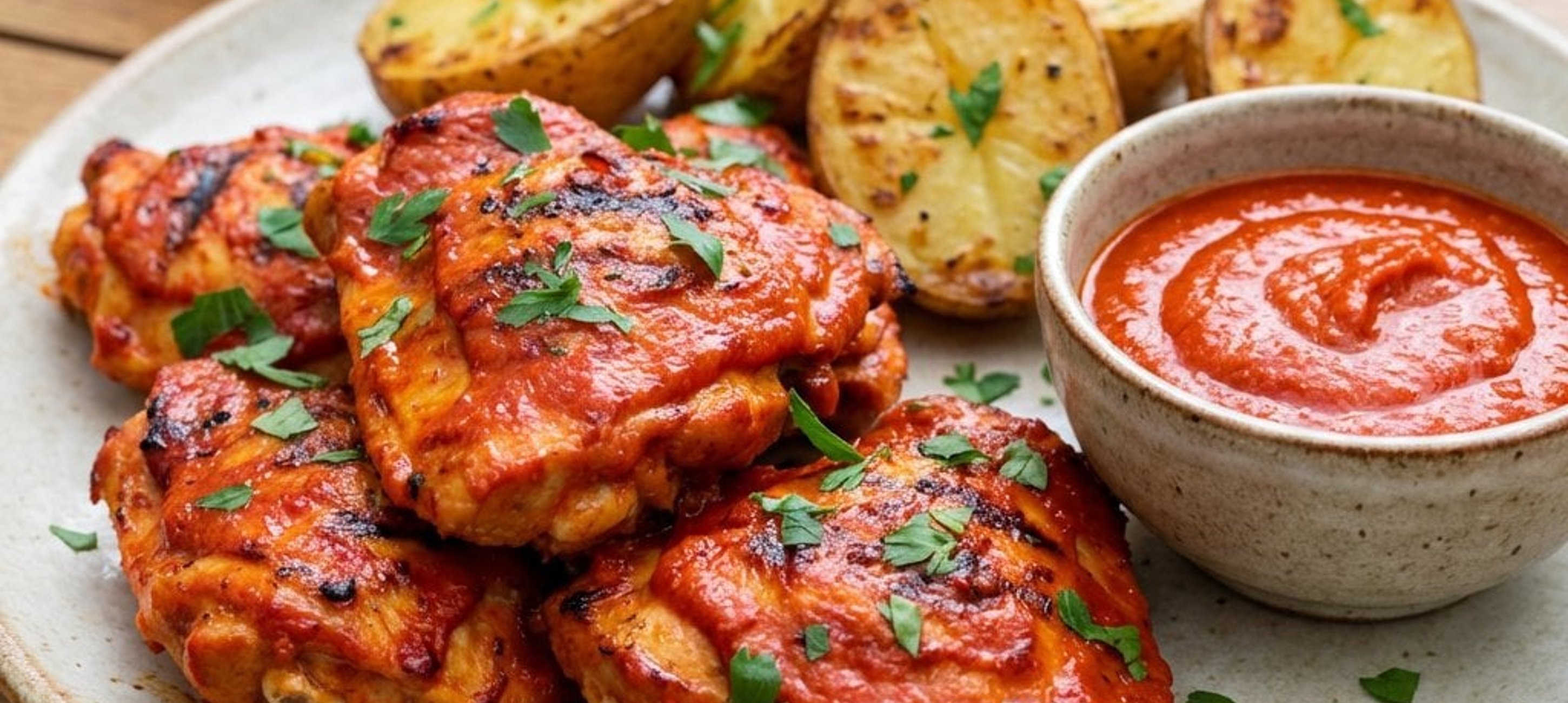 - 3Așezați jumătățile de cartofi pe grătar, cu partea tăiată în jos, și lăsați-le până când capătă o crustă aurie și crocantă. Serviți puiul și cartofii fierbinți, alături de sosul de marinadă păstrat, și decorați cu pătrunjel proaspăt tocat.