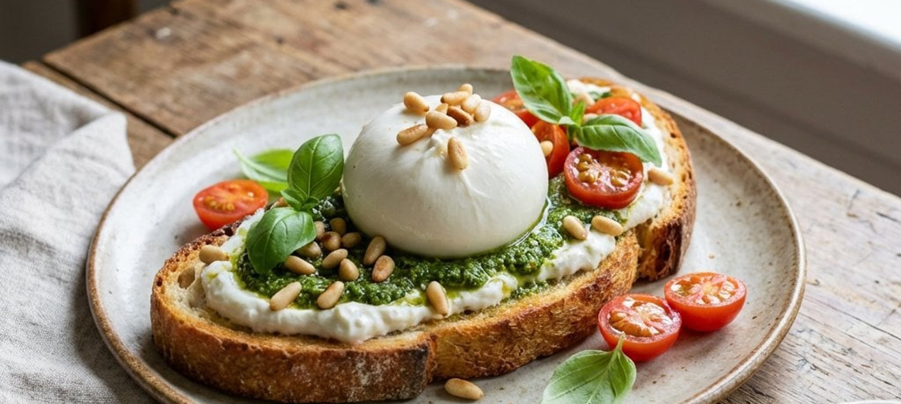 - 2Așezați brânza burrata întreagă deasupra și presărați mugurii de pin pe care i-ați tras anterior la tigaie, fără ulei, până s-au rumenit ușor.
