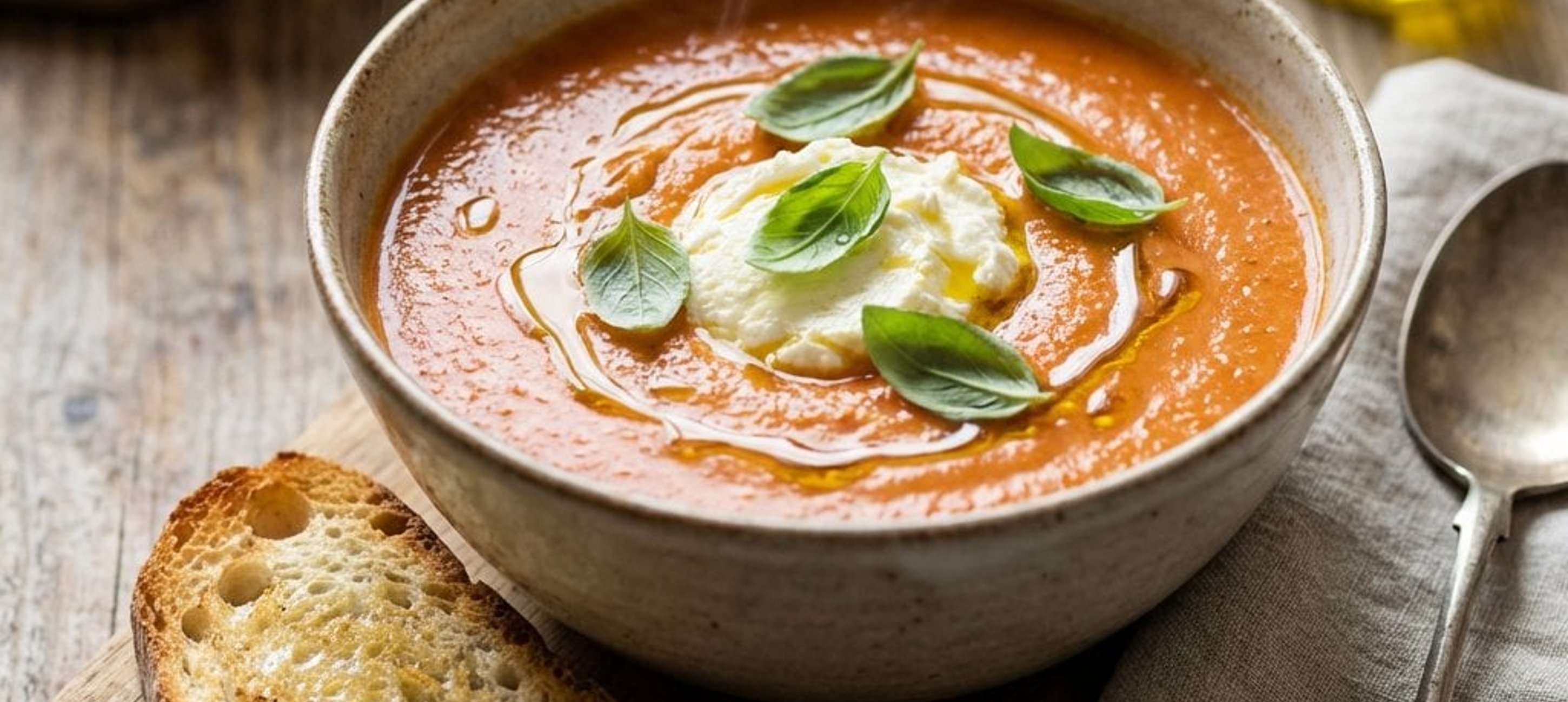- 3Turnați supa caldă în farfurii. Adăugați în mijloc o lingură generoasă de mascarpone, presărați parmezan ras și decorați cu frunze proaspete de busuioc. Serviți imediat alături de ciabatta crocantă.