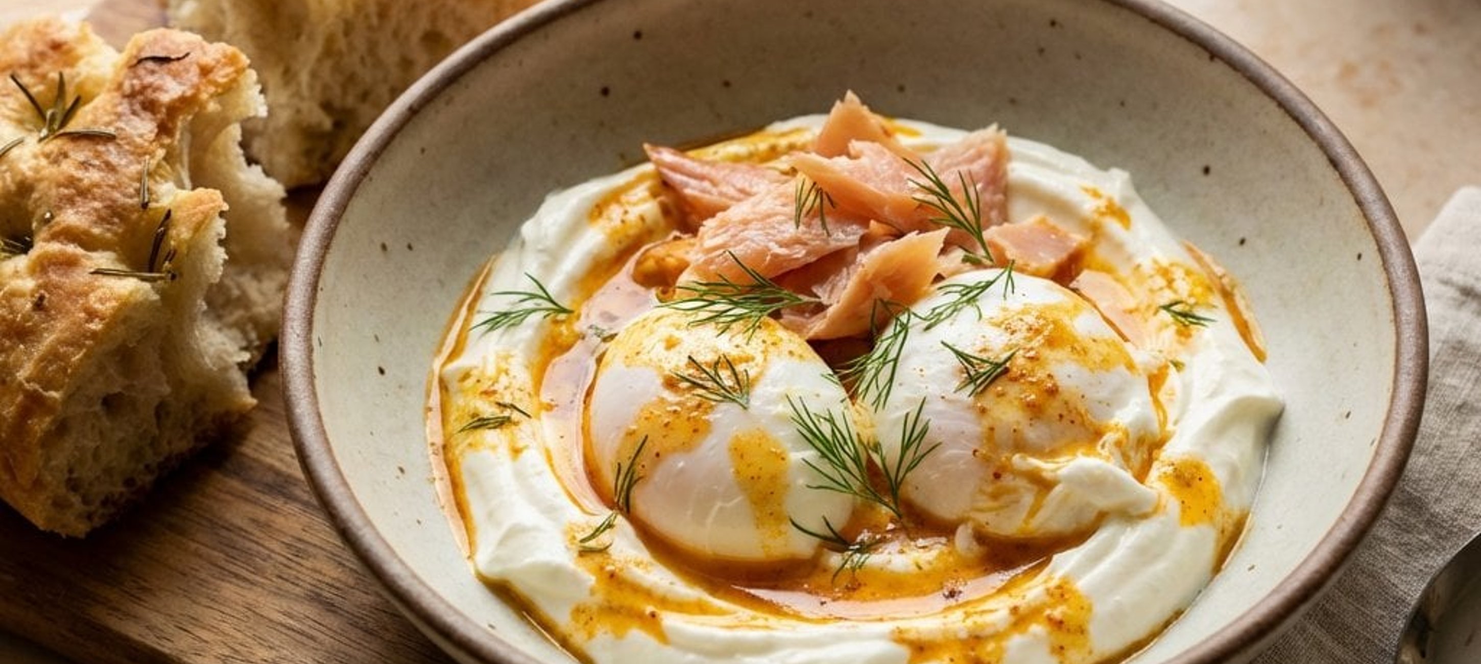 - 4Asamblare: Întinde crema de iaurt pe o farfurie întinsă. Așază deasupra ouăle poșate și fulgii de păstrăv afumat. Toarnă untul cald aromatizat peste ouă și presară mărar proaspăt tocat. Servește imediat alături de focaccia cu rozmarin încălzită ușor.
