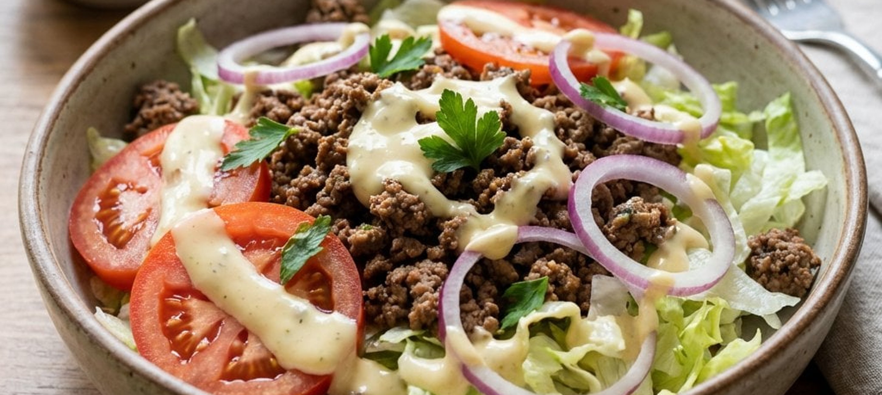 - 2Pregătiți 4 farfurii adânci sau boluri mari și distribuiți în ele salata iceberg, ceapa și roșiile. Adăugați carnea de vită gătită deasupra legumelor, turnați dressingul pregătit peste fiecare porție și serviți imediat.