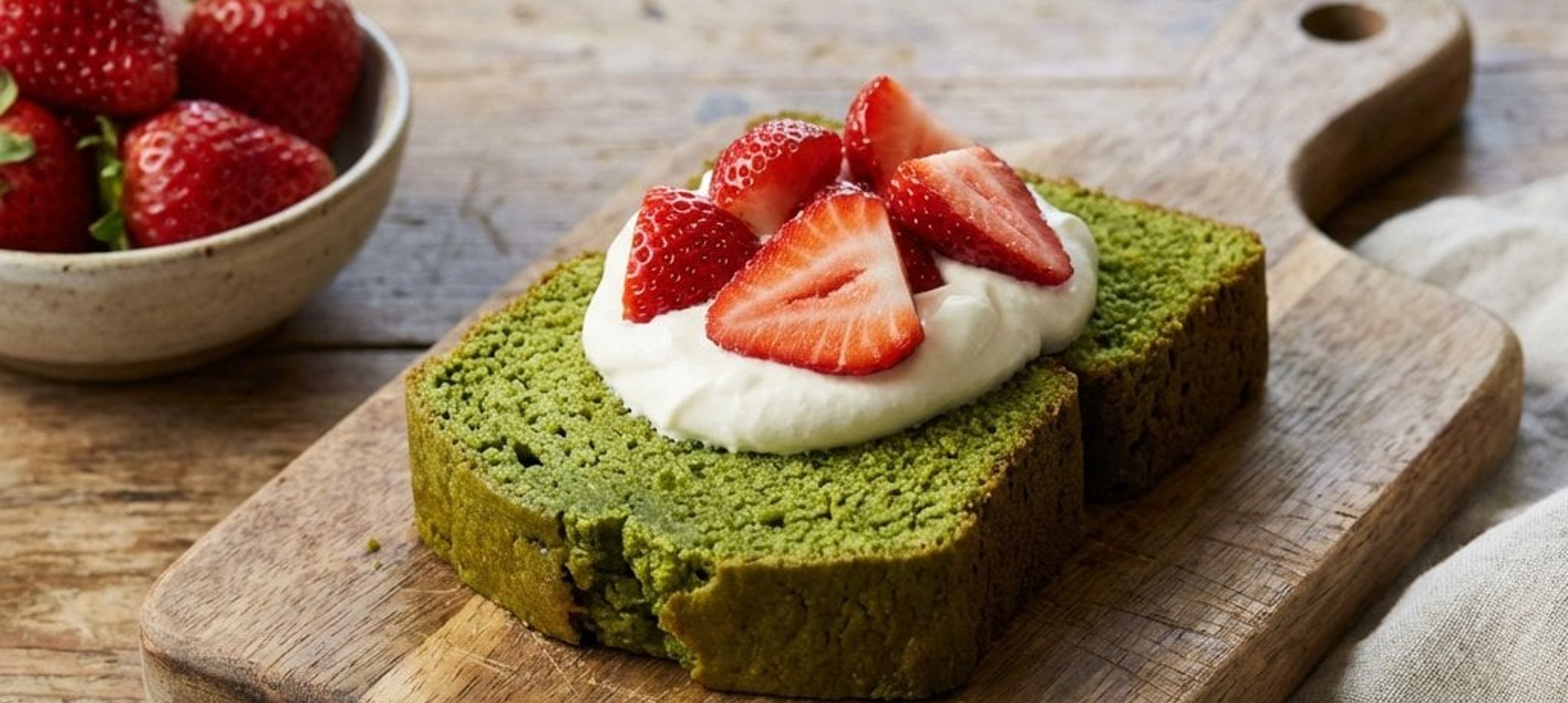 - 2Întindeți crema de matcha uniform peste checul răcit. Decorați cu căpșune proaspete tăiate felii. Poftă bună!