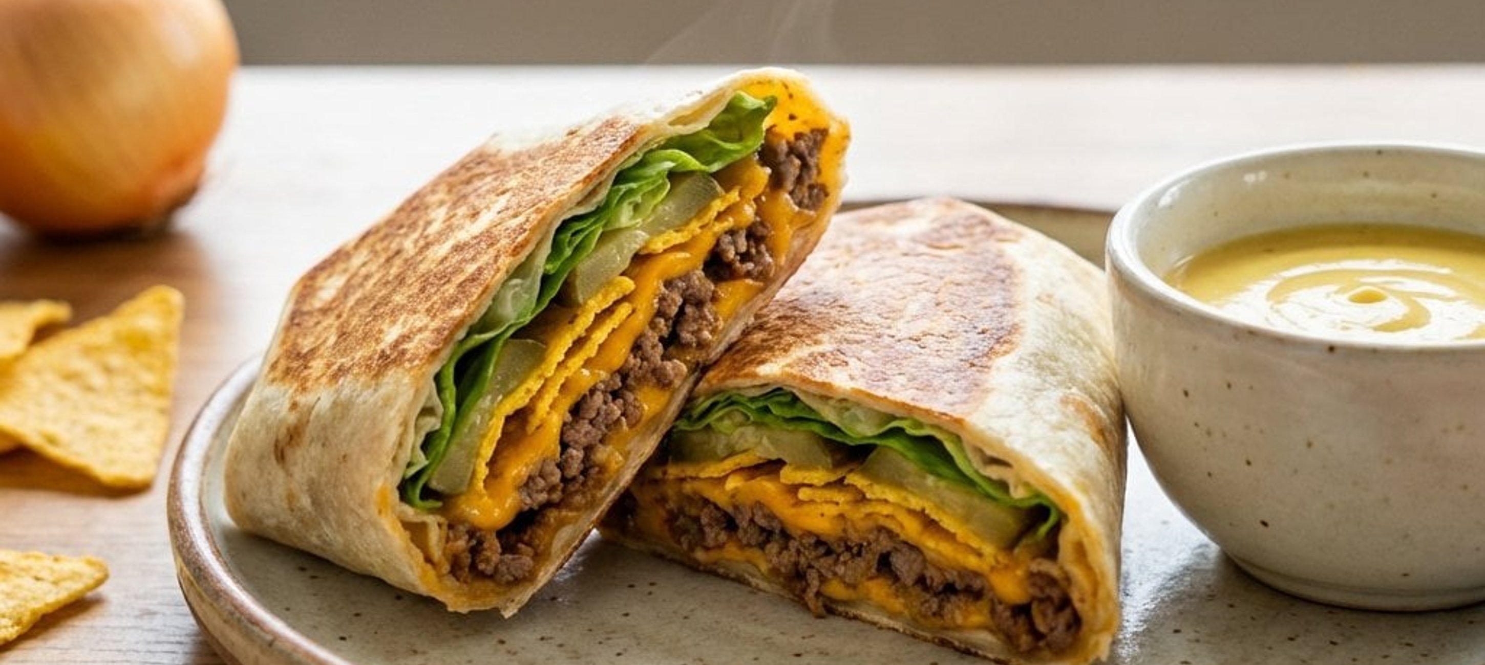 - 2Asamblarea: Întinde o tortilla mare și unge-o cu o parte din sos, lăsând o margine de aproximativ 3 cm liberă. Adaugă salata tăiată, chifteaua de vită fierbinte, feliile de brânză cheddar, castraveții murați feliați, ceapa caramelizată și un strat de nachos crocanți. Dacă tortillele sunt mici, poți folosi o a doua tortilla tăiată mai mic pentru a acoperi centrul înainte de a împacheta.