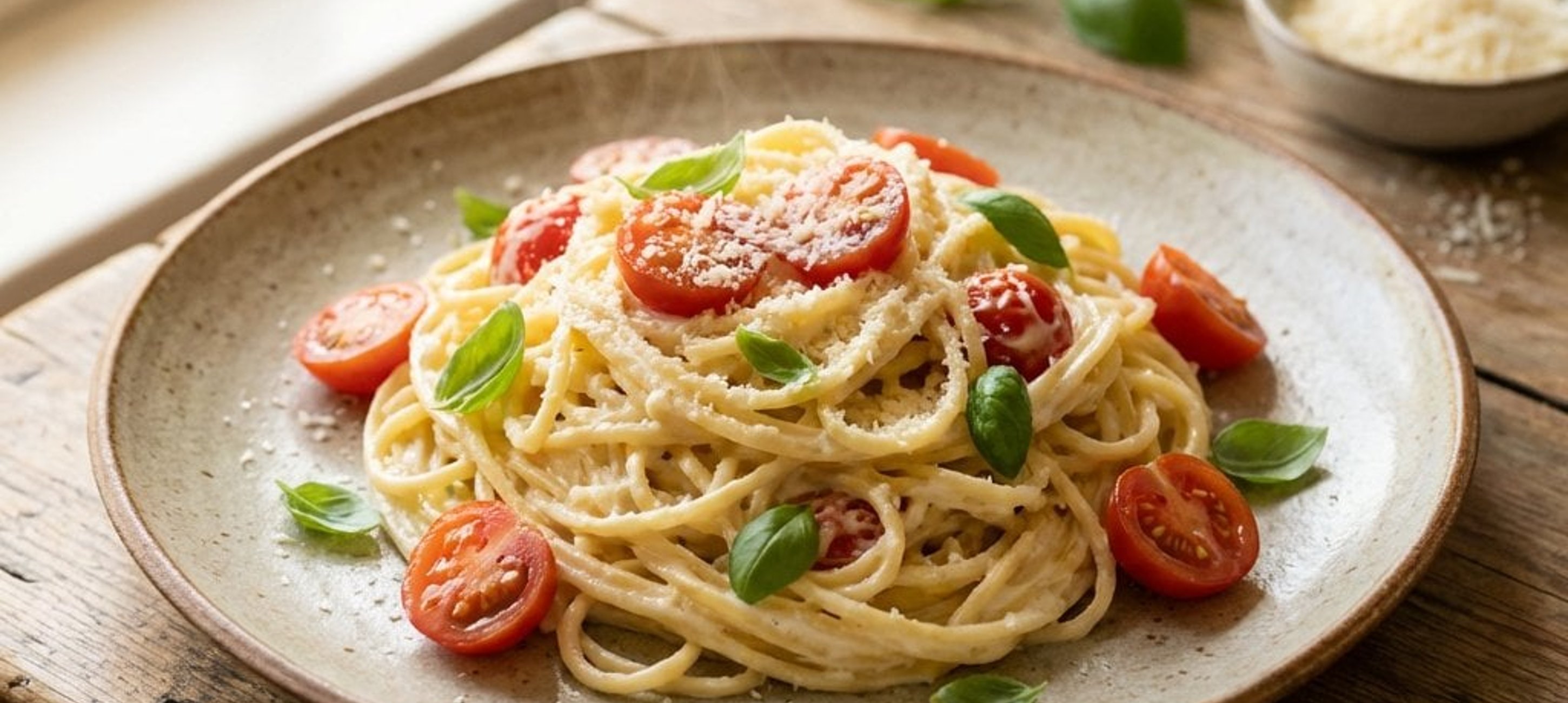 - 7Serviți imediat, presărând deasupra parmezan ras fin, decorând cu frunze de busuioc proaspăt și asezonând cu piper negru proaspăt măcinat.