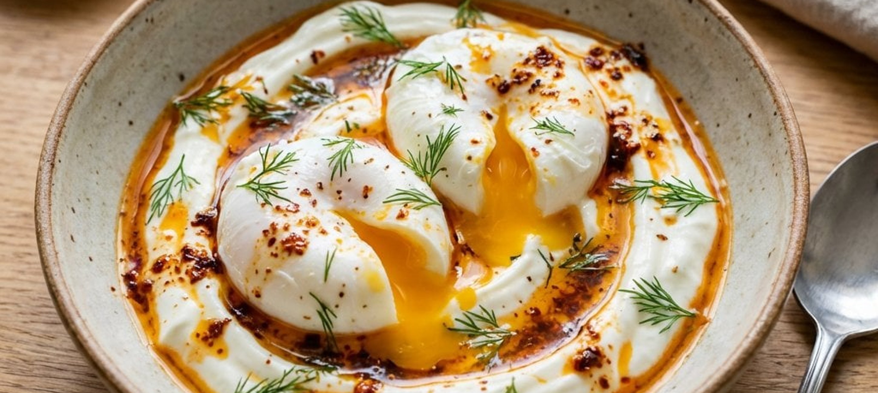- 2Pentru servire, puneți iaurtul pregătit în boluri, așezați deasupra ouăle poșate și turnați untul picant fierbinte. Puteți presăra puțin mărar proaspăt deasupra. Serviți imediat, ideal cu pâine prăjită. Poftă bună!