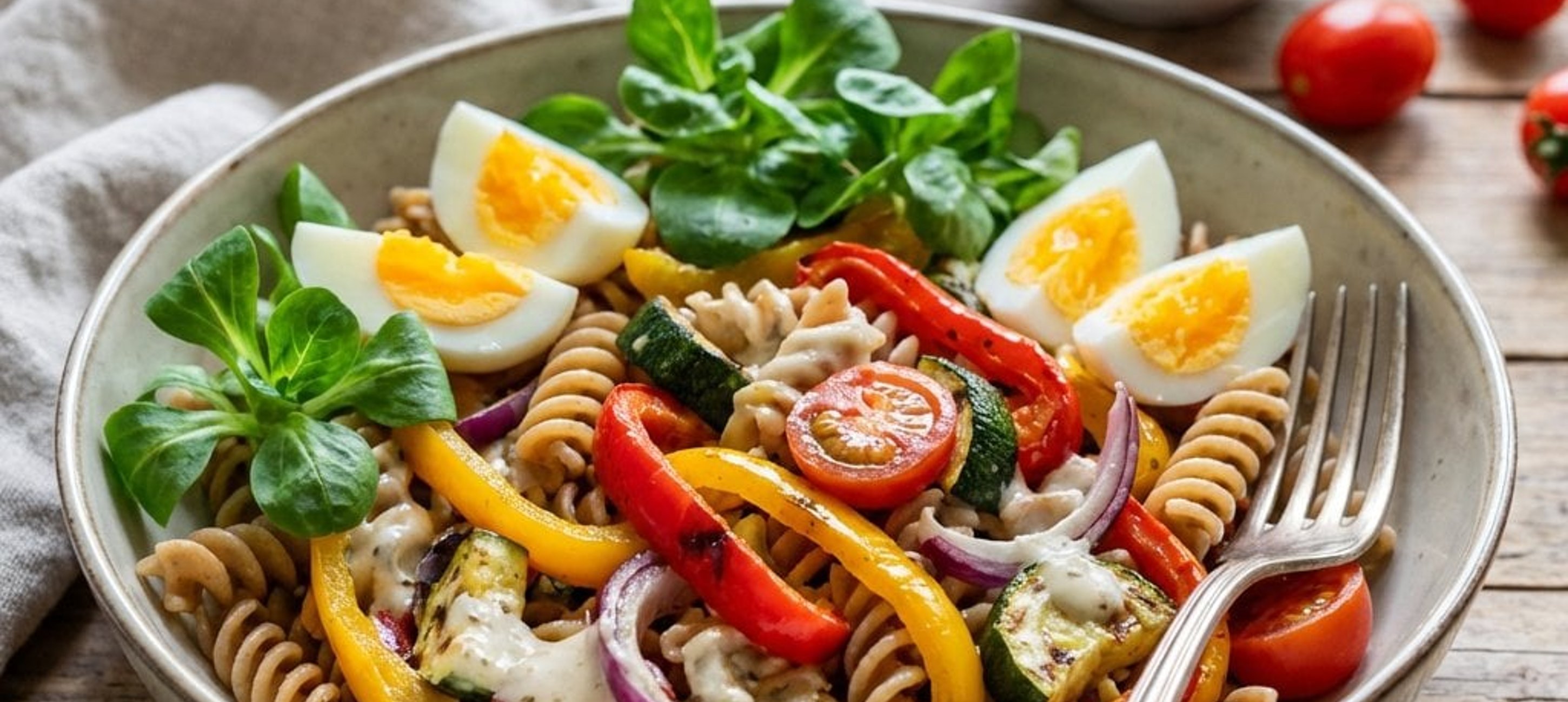 - 3Amestecați pastele fierte cu dressingul de usturoi copt. Adăugați frunzele de valeriană și legumele coapte, apoi amestecați ușor. Condimentați cu piper negru proaspăt măcinat și serviți cu ouăle fierte tăiate în jumătăți.