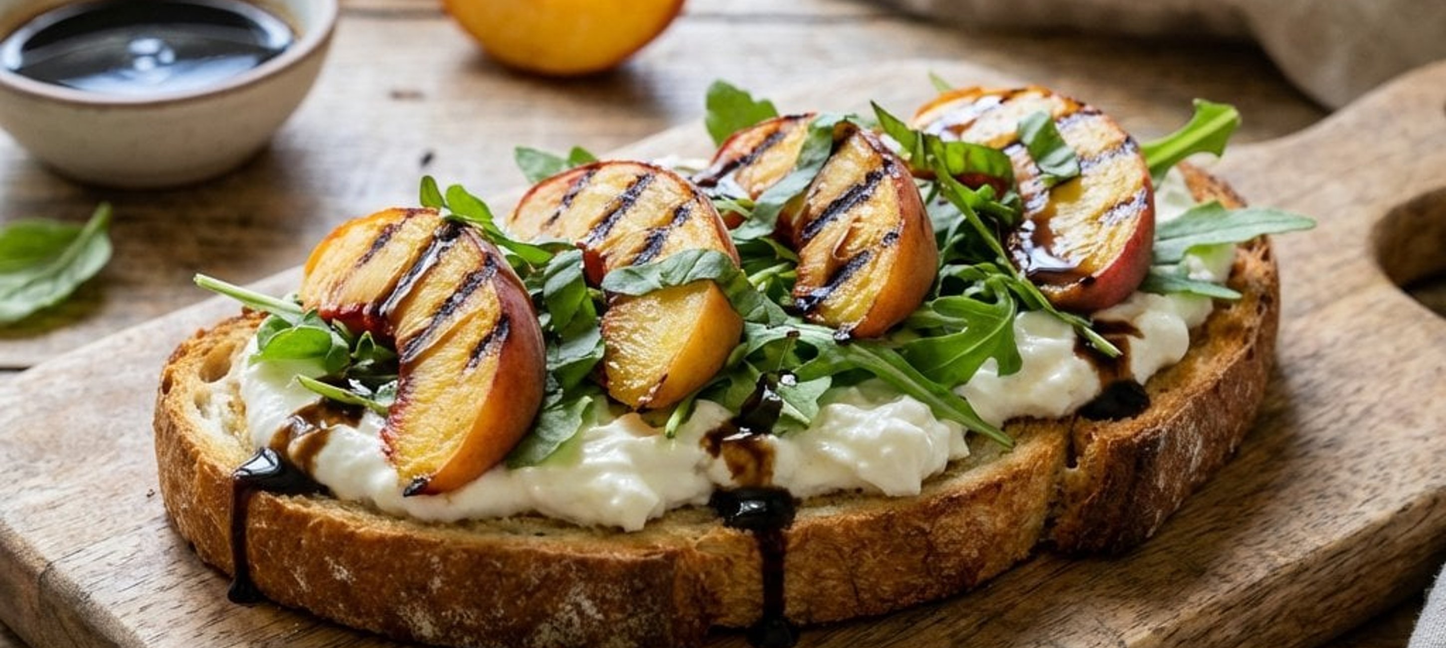 - 3Așezați pe fiecare felie de pâine burrata cremoasă, o mână de rucola, feliile de piersici coapte și frunze proaspete de busuioc.