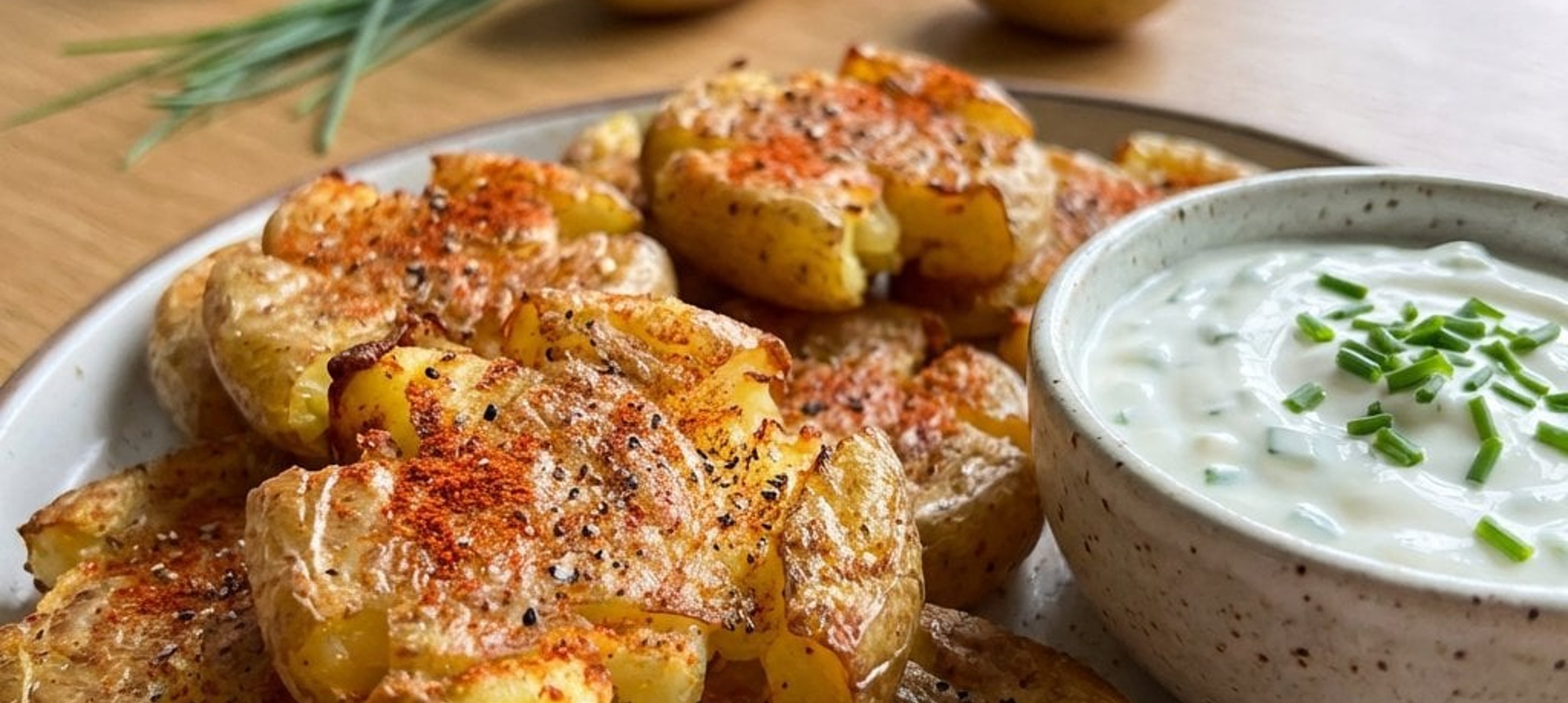 - 1În timp ce cartofii sunt la cuptor, pregătește sosul. Amestecă smântâna fermentată cu arpagicul tocat mărunt și usturoiul zdrobit, adaugă un praf de sare și omogenizează totul. Servește cartofii zdrobiți imediat, alături de dip-ul răcoros.