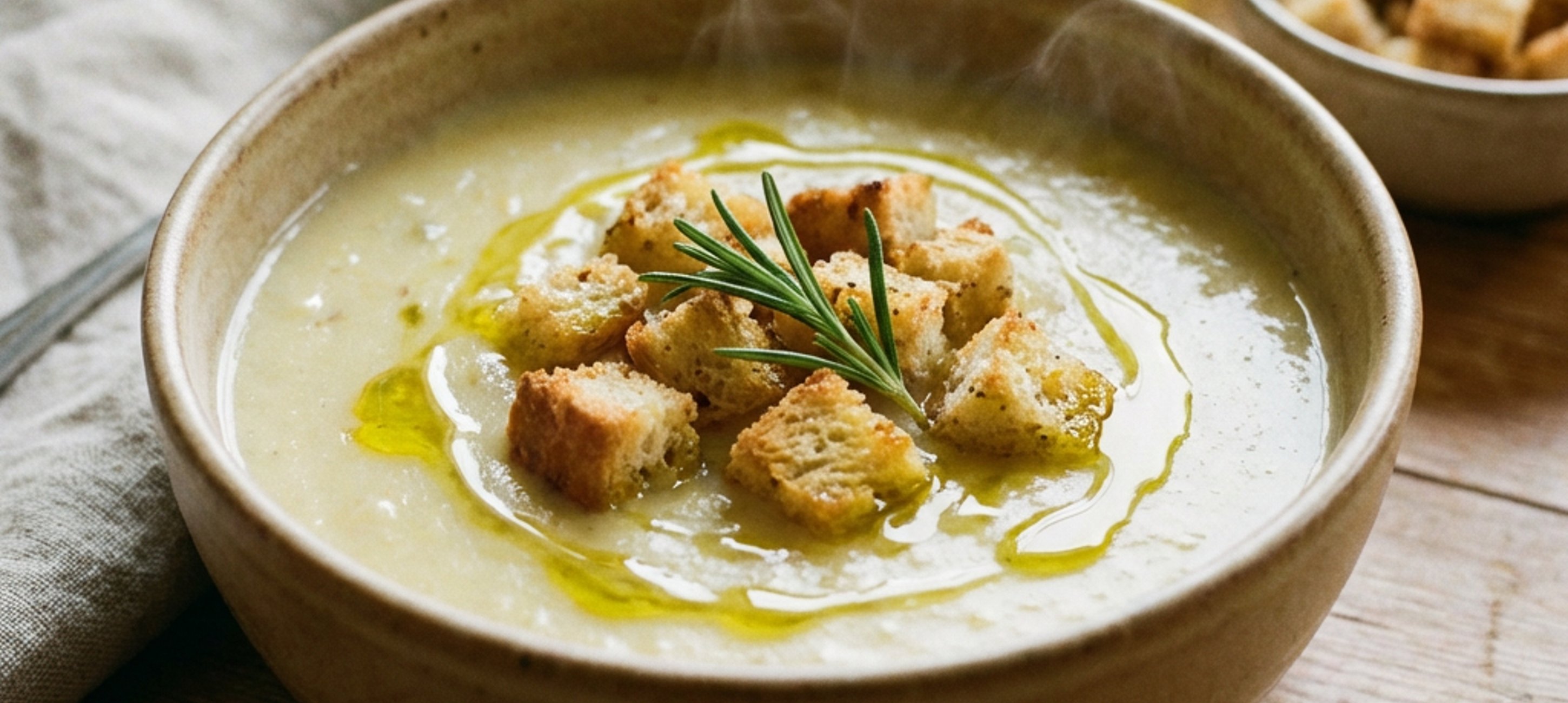 - 5Pentru crutoane: Tăiați bagheta sau chifla în cubulețe de aproximativ 0,5 cm. Într-o tigaie, topiți untul la foc mediu împreună cu puțin rozmarin. Adăugați cubulețele de pâine și prăjiți-le până devin aurii și crocante. Condimentați cu sare și piper, apoi lăsați-le să se răcească puțin.