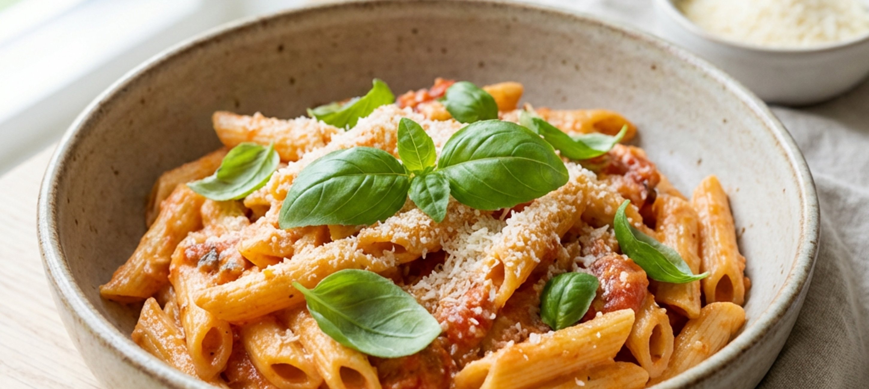 - 7Adăugați pastele fierte în tigaie și amestecați bine pentru a le acoperi cu sos. La final, încorporați frunzele de busuioc proaspăt rupte cu mâna.