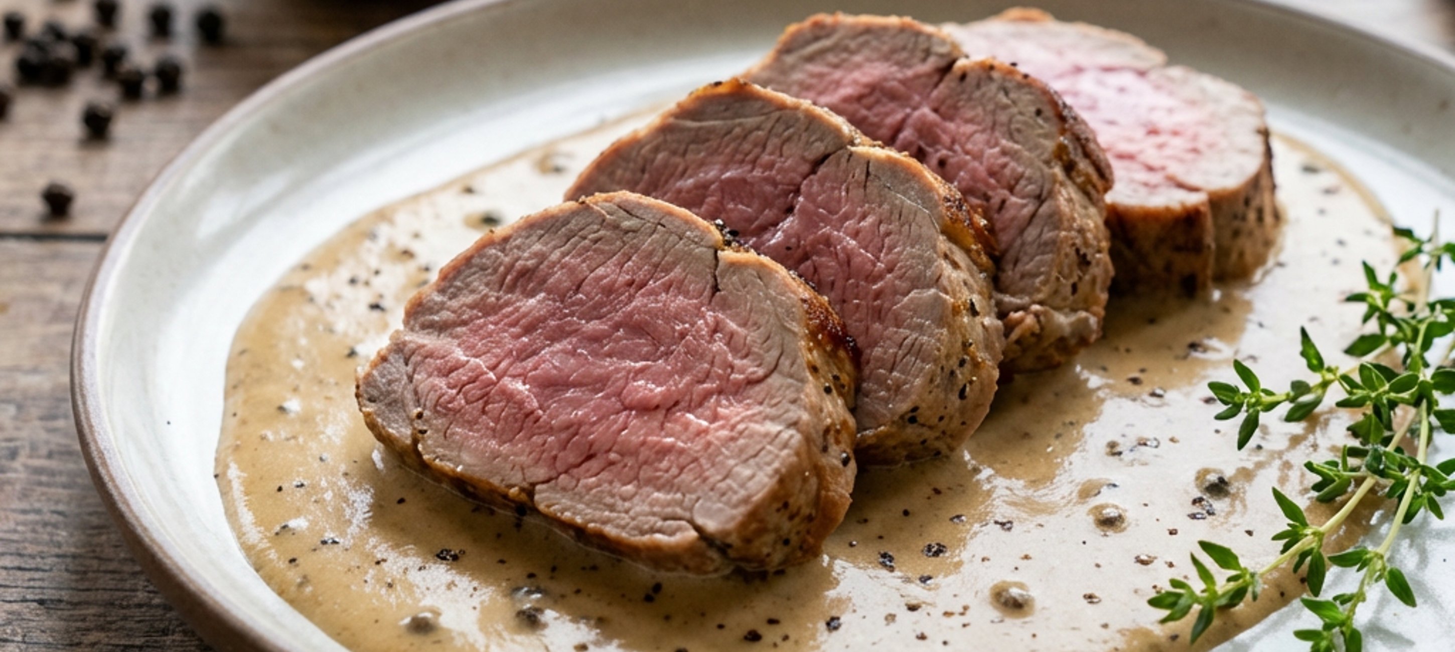 - 6Desfaceți mușchiulețul din folie și tăiați-l în felii de aproximativ 1 cm grosime. Turnați sosul de piper pe farfurie, așezați feliile de carne deasupra și serviți imediat. Poftă bună!