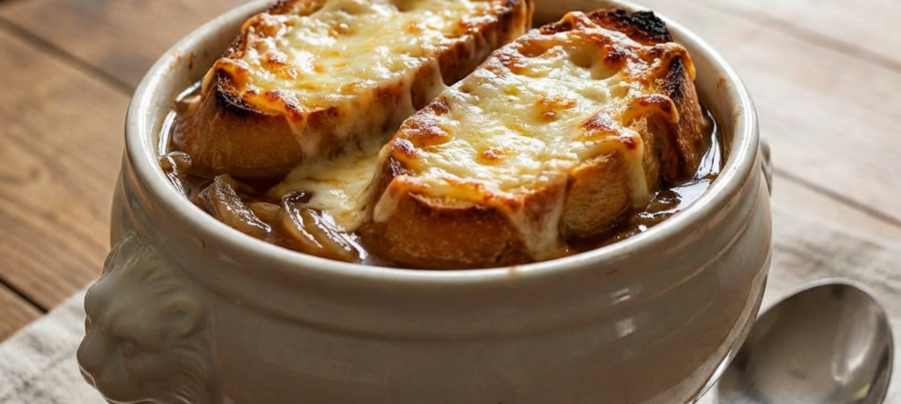 - 14Așezați câte 2 felii de baghetă prăjită în fiecare bol. Puneți deasupra felii de brânză Gruyère și presărați din abundență brânză rasă.