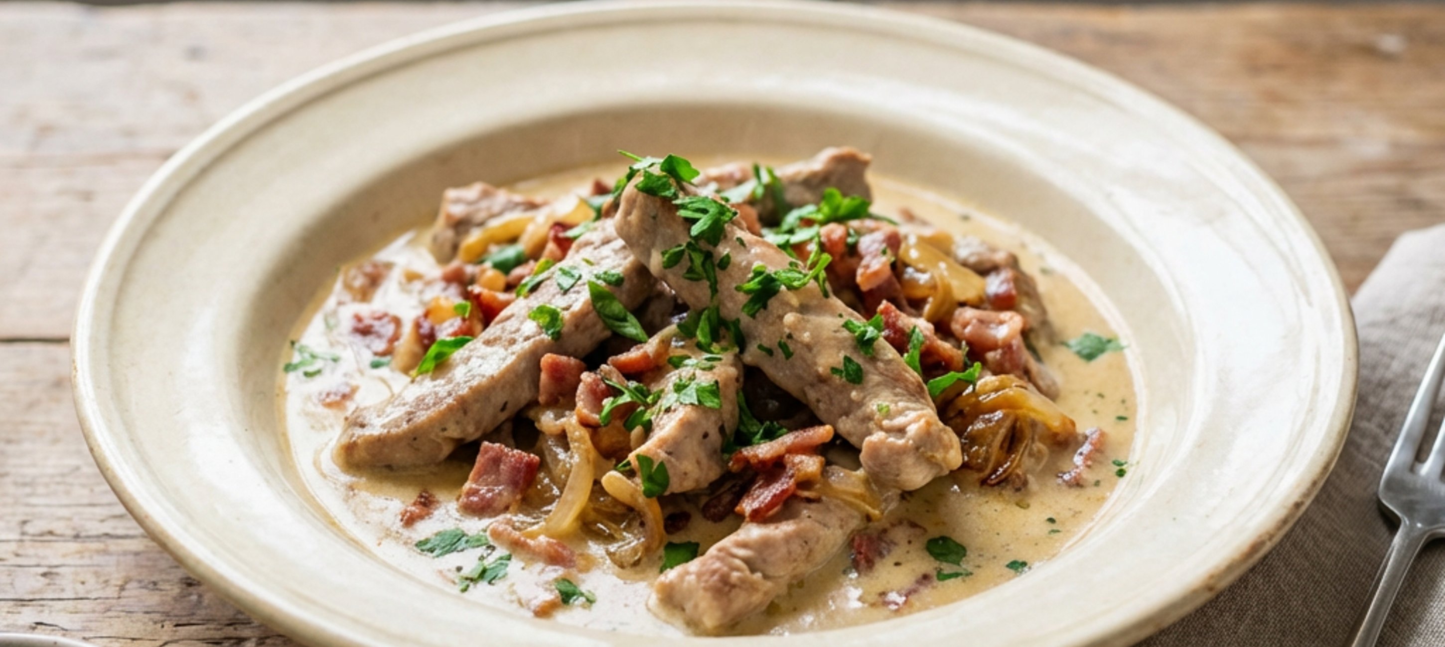 - 2Taie baconul în fâșii subțiri. Taie ceapa în jumătate pe lungime, apoi în felii subțiri (solzișori). Taie usturoiul în felii fine.