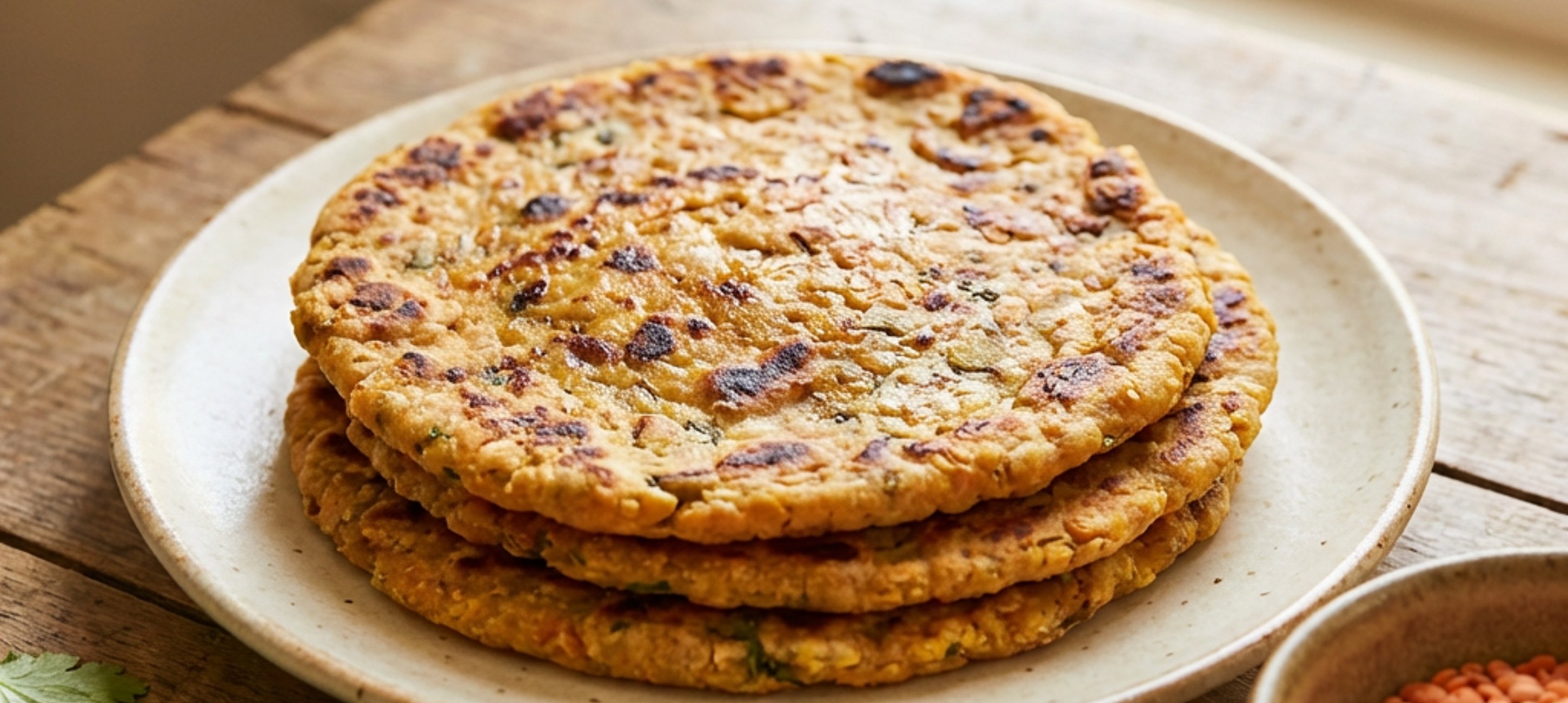- 3Încinge o tigaie antiaderentă de dimensiune medie (aproximativ 20 cm diametru) la foc mediu, fără a adăuga grăsime. Redu focul la mic spre mediu și prepară pe rând 4 lipii: toarnă câte un sfert din compoziție în tigaie și coace-o timp de 2–3 minute pe fiecare parte, până când devine aurie.