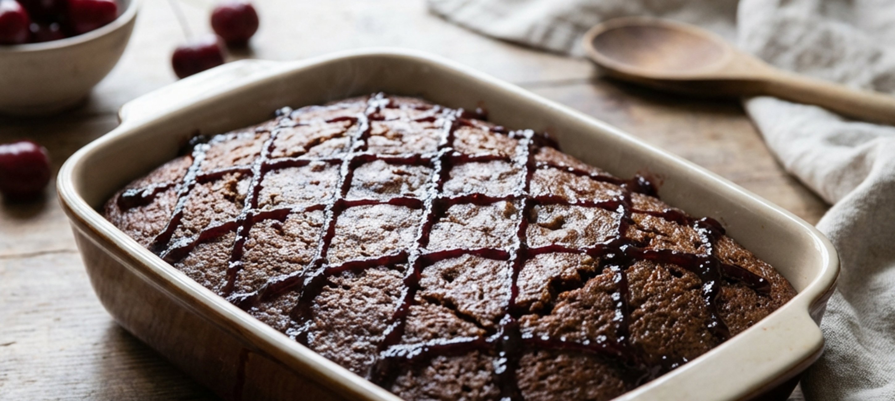 - 3Puneți gemul de vișine într-un poș (sac de cofetărie) și trasați o grilă oblică deasupra aluatului crud.