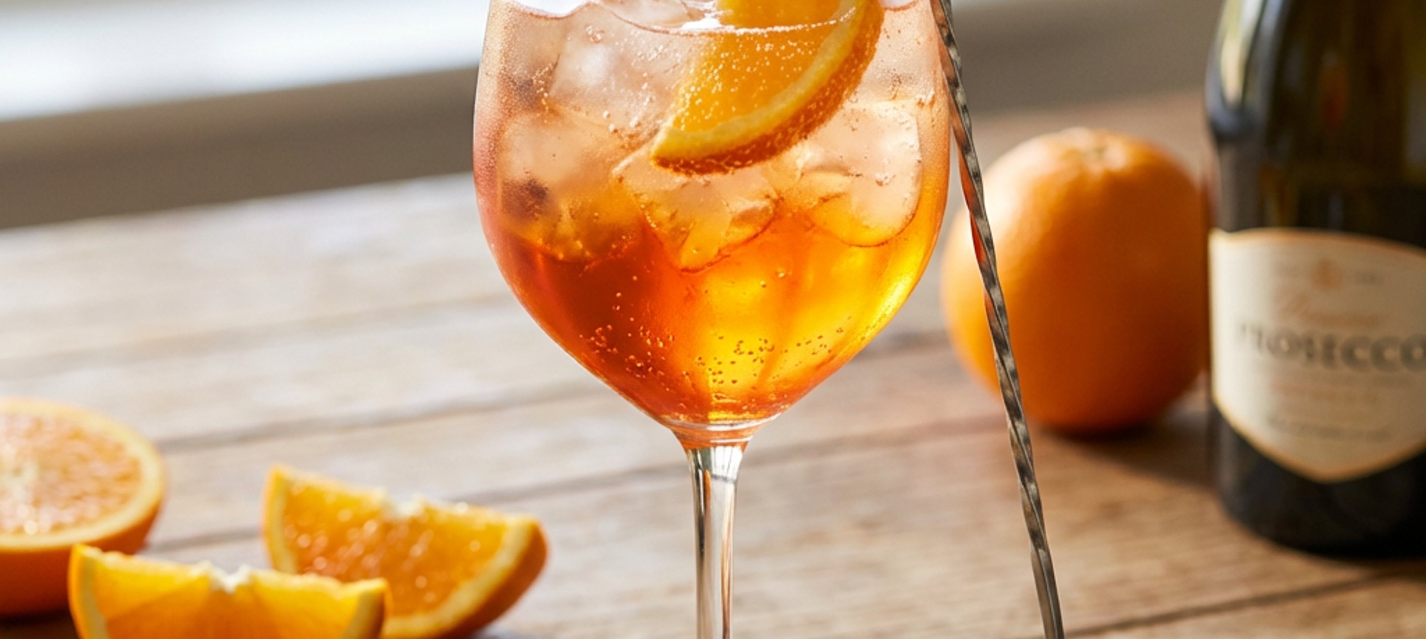 - 1Umple un pahar specific de Aperol Spritz, sau un pahar de vin, cu gheață
