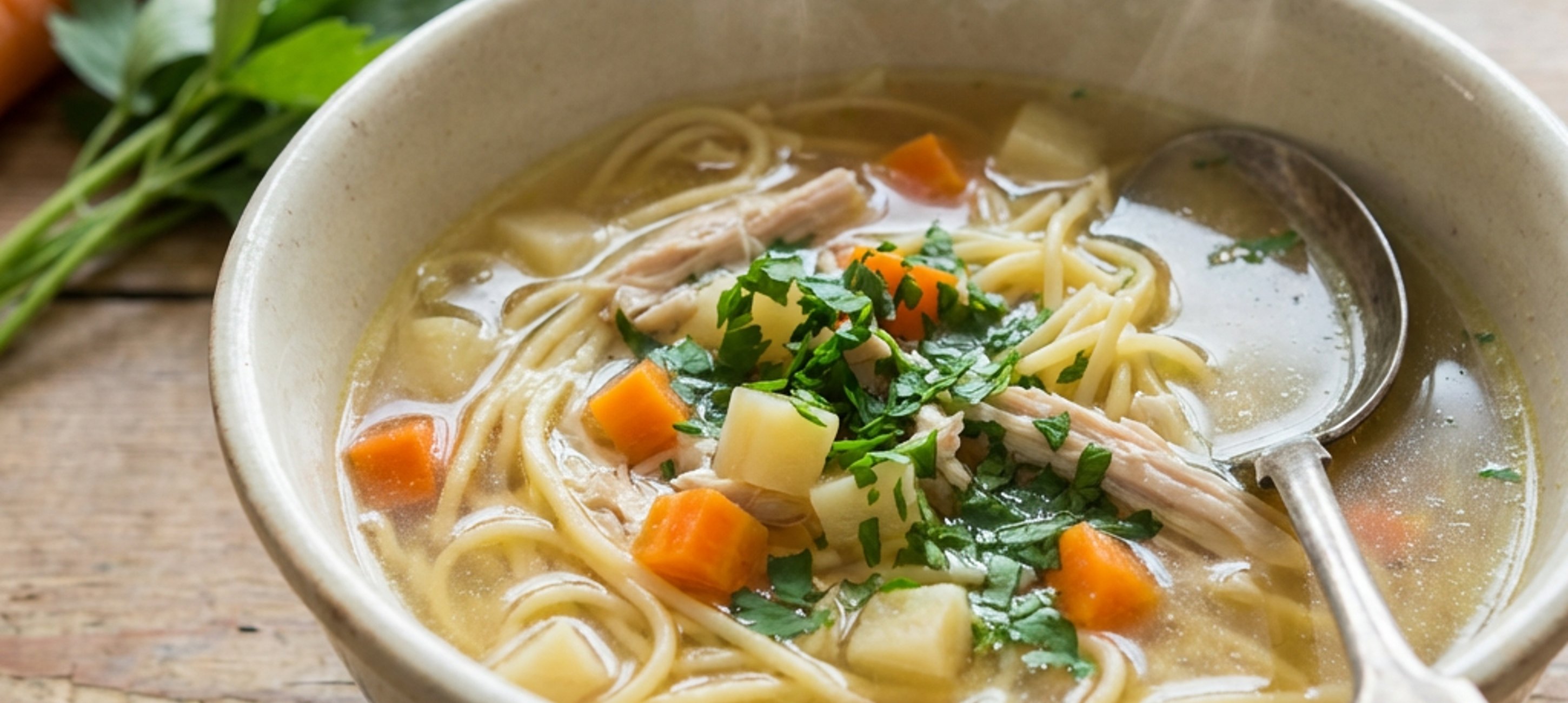 - 5Pentru servire, puneți o porție de tăieței într-o farfurie adâncă, turnați supa fierbinte deasupra și presărați pătrunjel verde tocat fin.