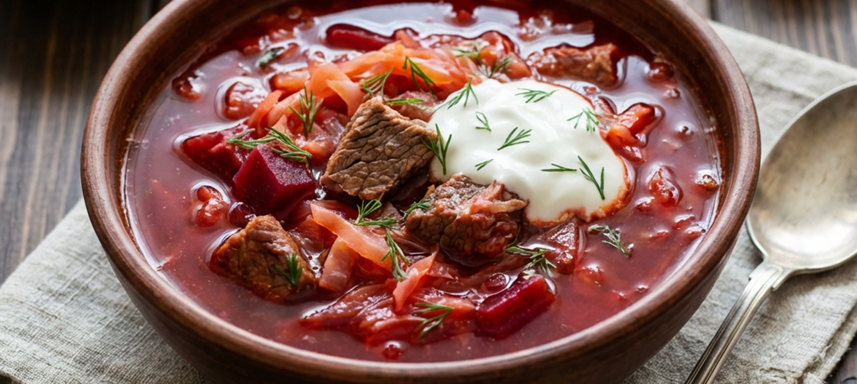 - 13Servește borșul fierbinte, cu o lingură de smântână fermentată deasupra și, opțional, decorează cu mărar proaspăt.