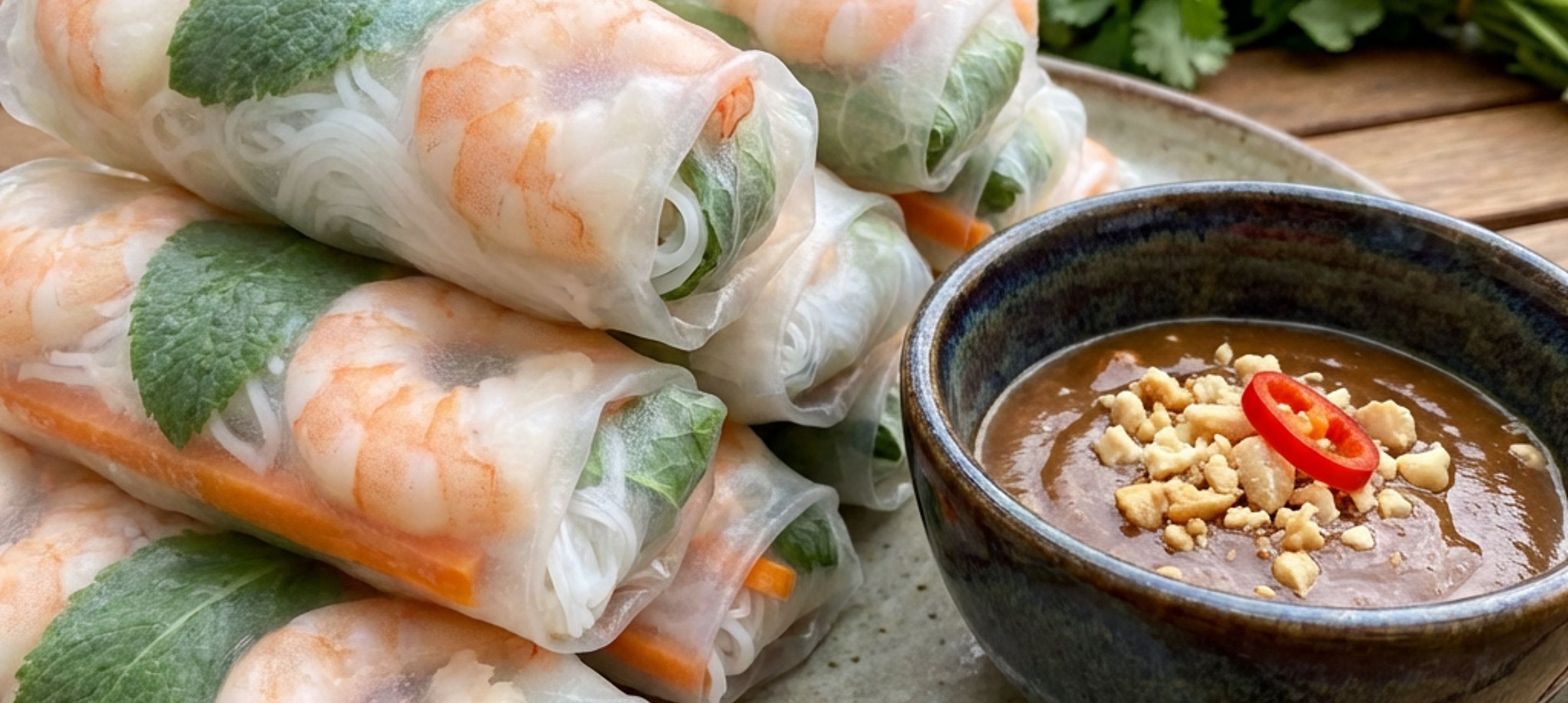- 3Serviți pachețelele de primăvară proaspete alături de sosul cald de arahide. Se recomandă consumul imediat pentru a păstra prospețimea ingredientelor și textura foii de orez.