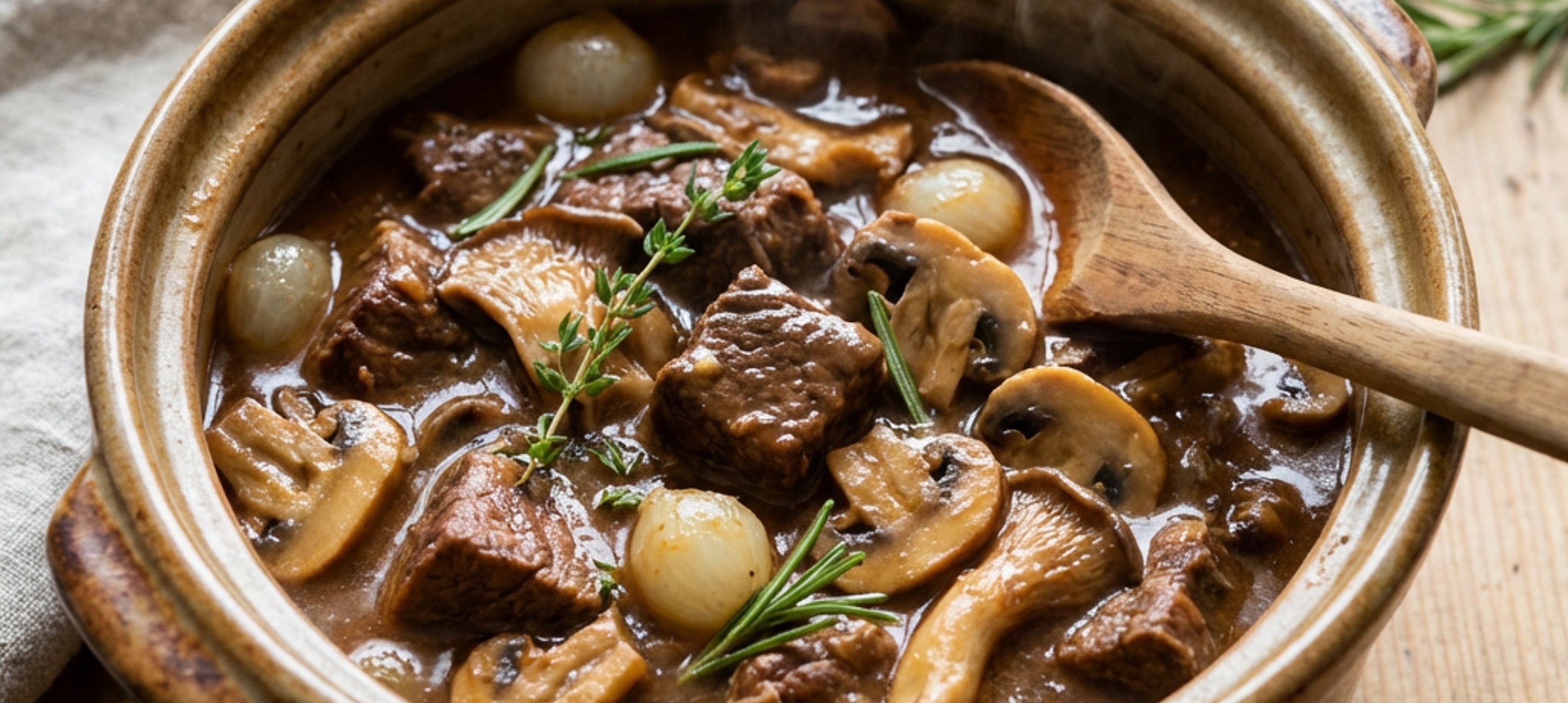- 4Puneți carnea înapoi în cratiță și turnați vinul alb. Folosiți o spatulă pentru a răzui resturile rumenite de pe fundul vasului. Lăsați vinul să se evapore complet. Adăugați ciupercile uscate și 500 ml de apă. Amestecați, acoperiți cu un capac, reduceți focul la minim și lăsați să fiarbă înăbușit timp de aproximativ 1,5 ore, până când carnea este fragedă.