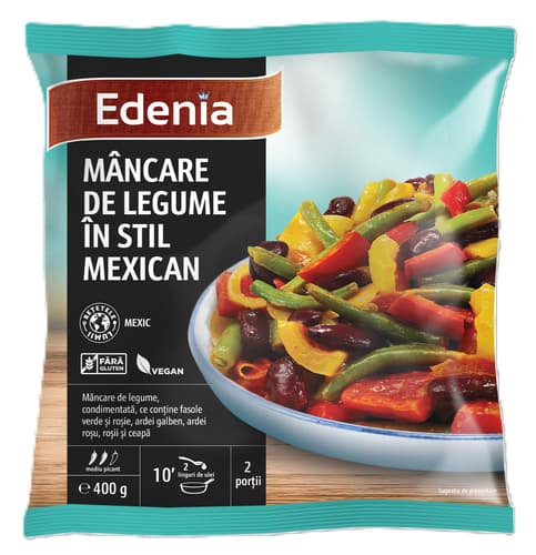 Mix de legume in proportii variabile 93% (fasole verde taiata, boabe de fasole rosie prefiarta (apa, boabe de fasole rosie, sare), ardei gras galben, ardei gras rosu, rosii, ceapa), apa, ulei de floarea soarelui, sare, amidon din porumb,pudra din condimente si ierburi, dextroza, extract de ierburi si legume.