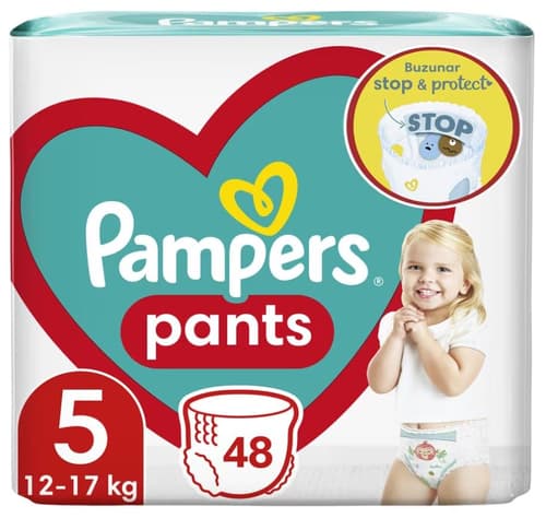 Pampers Pants Diapers Size 5 are the first diapers with a Stop & Protect pocket which, combined with the all-around fit, offers protection against any type of leakage for up to 12 hours. They also have a super absorbent core that absorbs moisture instantly and double leg cuffs that help prevent leaks around the legs.
