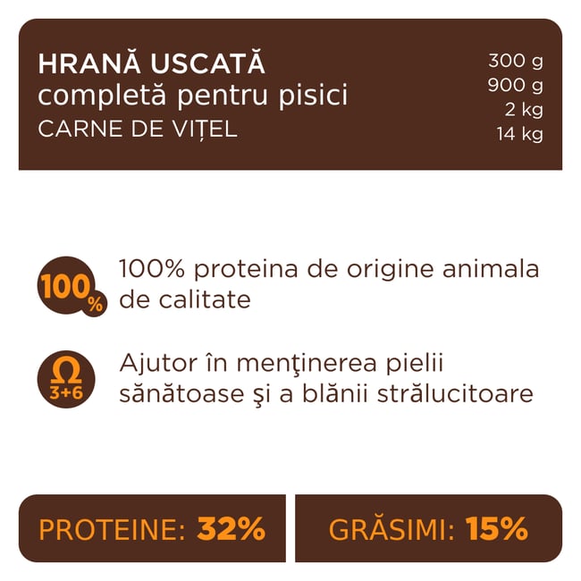 Premium dry food has meat as its main ingredient, at a percentage of 32%. The crunchy kibble with veal meat has an excellent taste and is designed for adult cats. The complex of unsaturated fatty acids Omega 3 + Omega 6 maintains healthy skin and a shiny coat. The food is enriched with the inTEGRAMIX formula for the general support of the pet's health and immunity. ADDITIVES: A, D3, E, C, K3, B1, B2, calcium D-pantothenate, niacin, B6, folic acid, B12, biotin, choline chloride, trace elements and amino acids.