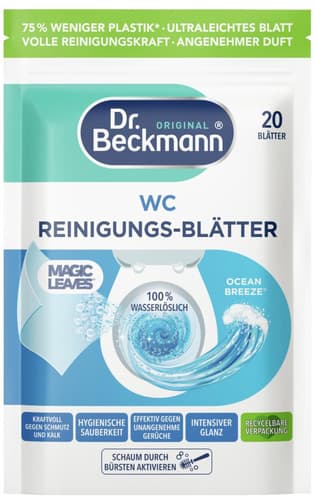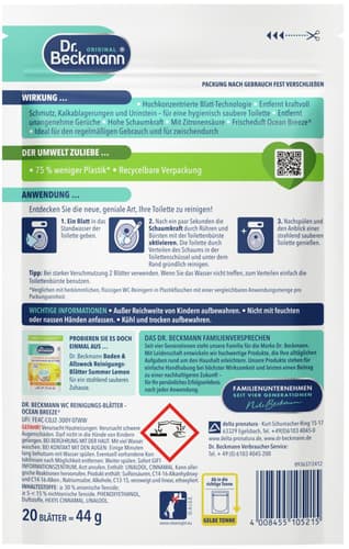 Experience powerful cleaning with Dr. Beckmann Toilet Cleaning Wipes in Ocean Breeze. These German-made Magic Leaves offer hygienic cleanliness, effectively removing dirt, limescale, and unpleasant odors. Featuring a highly concentrated technology with citric acid and high foaming power, they leave an intense shine. The convenient 1-piece pack is ideal for regular use, boasting recyclable packaging with 75% less plastic. Simply drop a wipe, brush, and flush for a sparkling toilet.