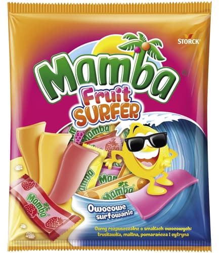 Surfboard-shaped gummy candies with fruit flavor. So smooth, so fruity, so cool! The package contains 14 caramels with flavors of: strawberry, raspberry, lemon, and orange. Mamba products are gluten and lactose-free. Net weight: 140g ℮. Store in a cool, dry place! Best before/Lot number: see back of the package, bottom left. With a history of over 70 years, Mamba was launched in 1953 in Germany, being one of Storck's oldest brands, loved by children of all ages. Each Mamba pack is filled with delicious fruity flavors, from strawberry and raspberry to lemon and orange. The soft and chewy texture, along with the strong fruit taste, makes Mamba an irresistible choice for anyone craving a moment of sweet satisfaction. Each piece is individually wrapped, making them easy to share and perfect for enjoying anywhere and anytime.