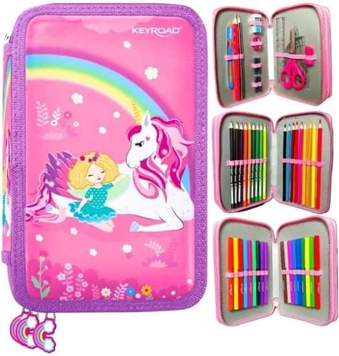 Discover the Keyroad equipped pencil case, with 3 zippers, pink, a pencil case like a dollhouse, full of colorful surprises, perfect for little artists from kindergarten and school! This pencil case is like a treasure chest, having everything you need to draw, color, and write, organized into 3 zippered compartments, so you can easily find every little thing.