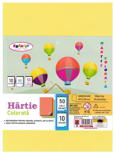 Recommended for Art&Craft, Posters, Labels. Ideal for Activities in Kindergartens, Schools, Creative Workshops. 80 gsm paper, 10 colors, 50 sheets/pack