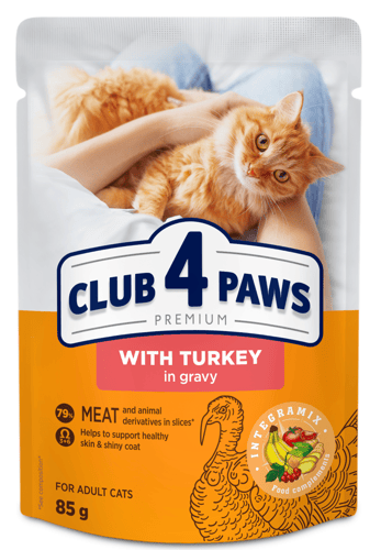 CLUB 4 PAWS Premium "With turkey in gravy". Сomplete canned pet food for adult cats