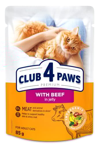 CLUB 4 PAWS Premium "With beef in jelly". Сomplete canned pet food for adult cats