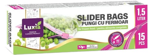 Luxia food storage bags with zip closure are suitable for storing and organizing food. They have a 1.5 L capacity and measure 20 × 20 cm, for use in the refrigerator or freezer.