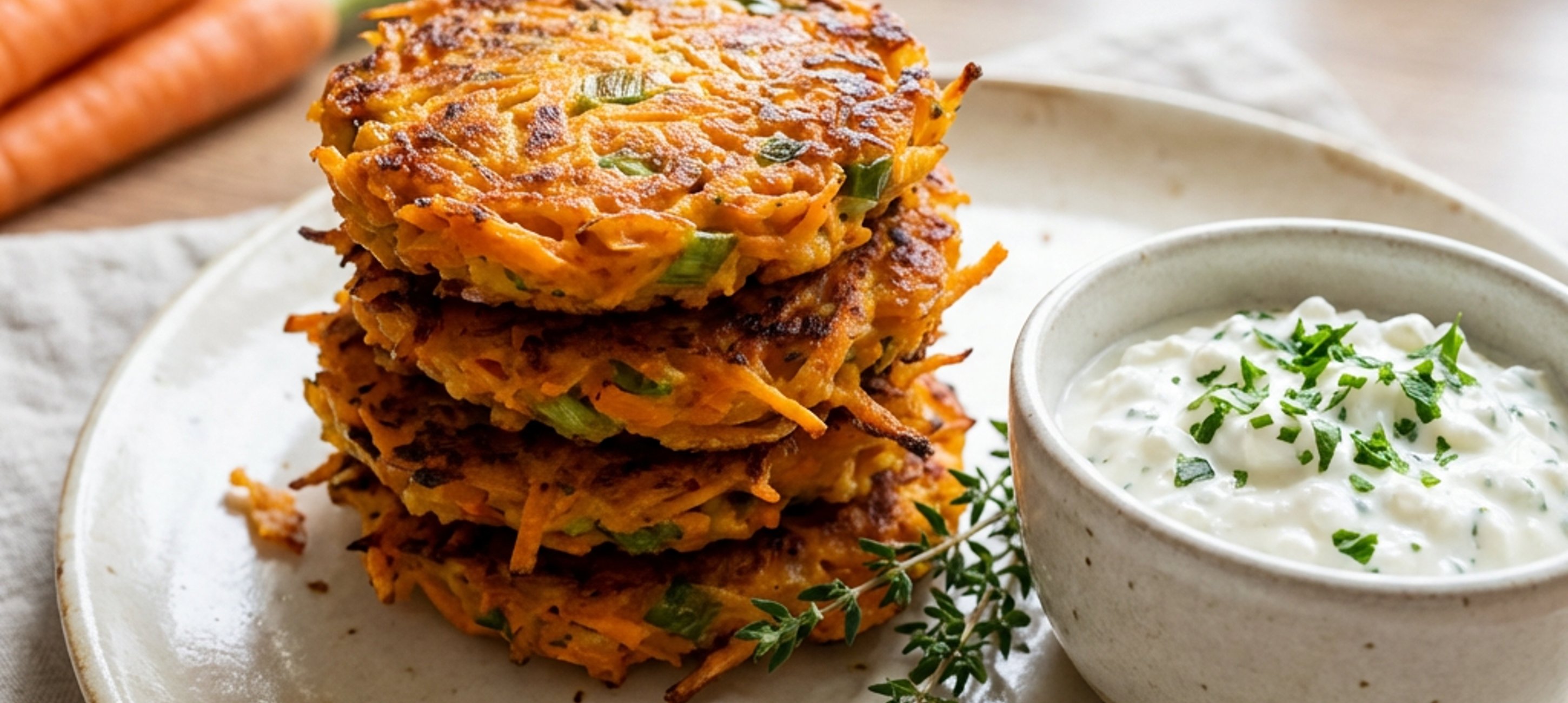 - 1Peel and finely grate the carrots. Place them in a bowl and add the finely chopped green onion, a crushed garlic clove, thyme leaves, eggs, and flour. Season with salt and pepper, then mix everything until you get a compact and sticky dough.