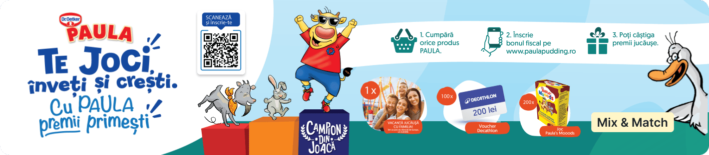 Buy any PAULA product, enter the fiscal document number on www.paulapudding.ro and you can win one of the campaign prizes. The promotion runs from September 1st to November 30th, 2025. More details in the regulations and on www.paulapudding.ro.