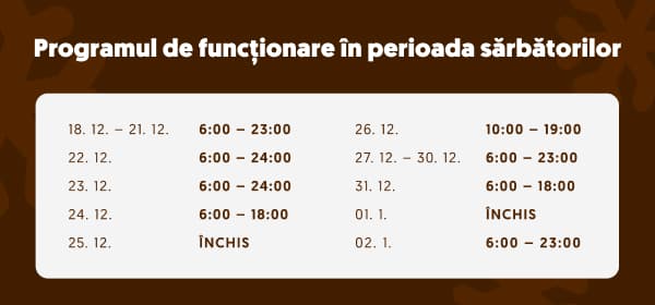 Ți-am pregătit un program special pentru sărbătorile de iarnă și începutul de an, ca să știi exact când suntem aici pentru tine.